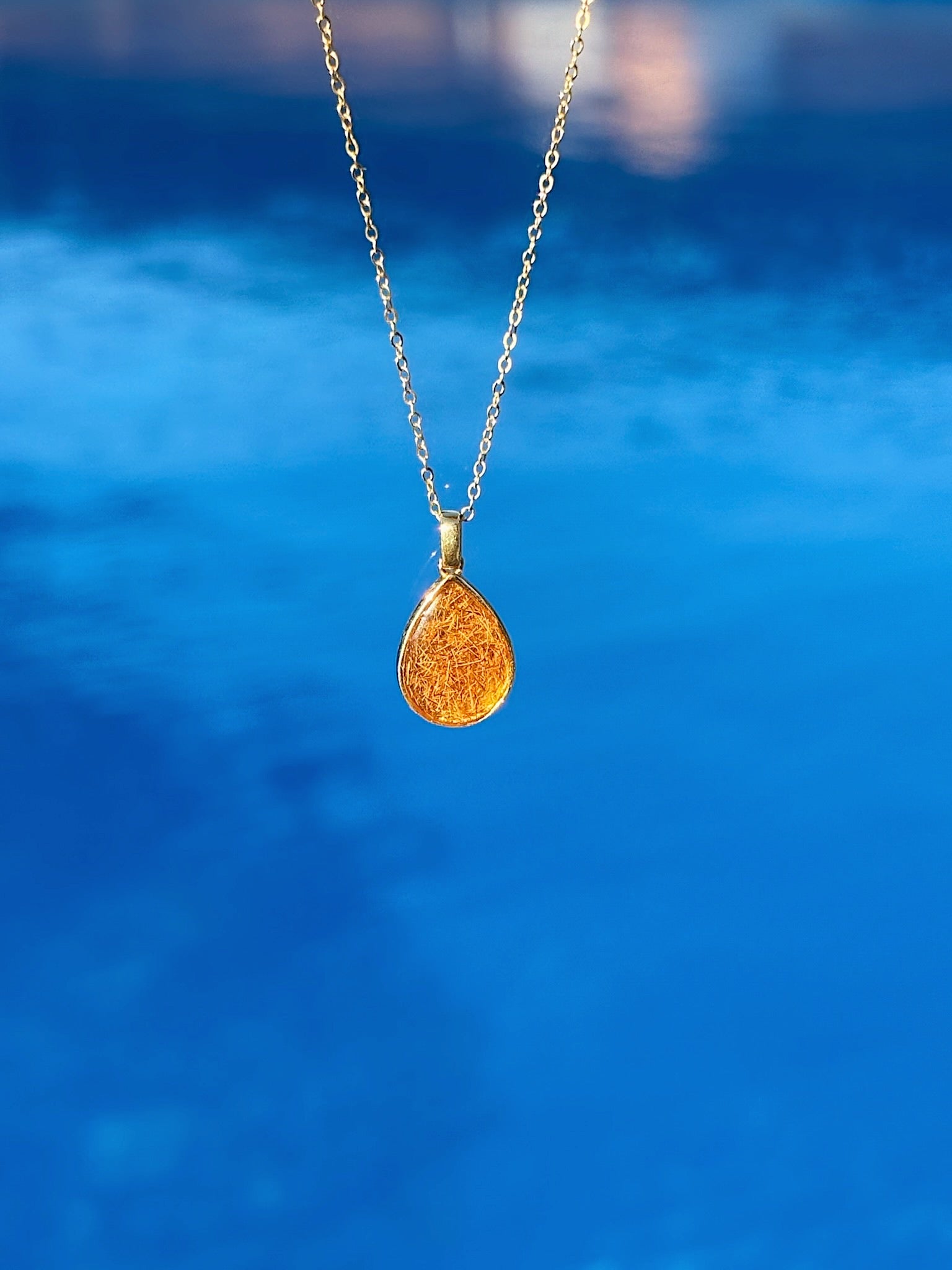 En lugar de una piedra común, este colgante lleva una pieza personalizada creada artesanalmente con los pelos de tu mascota, encapsulados con mimo en resina transparente de alta resistencia.