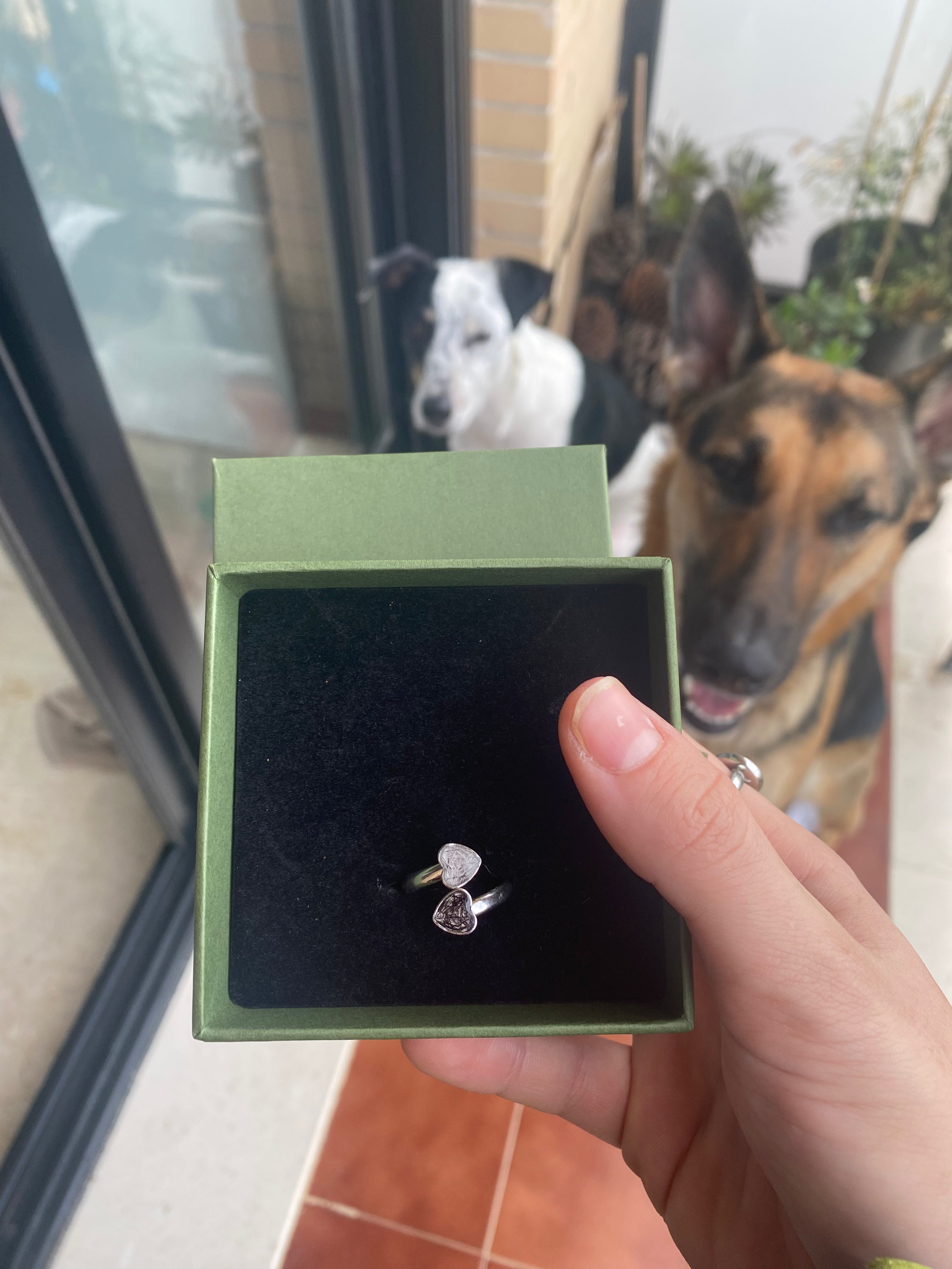 En lugar de una piedra común, este colgante lleva dos piezas personalizada creada artesanalmente con los pelos de tu mascota, encapsulados con mimo en resina transparente de alta resistencia.