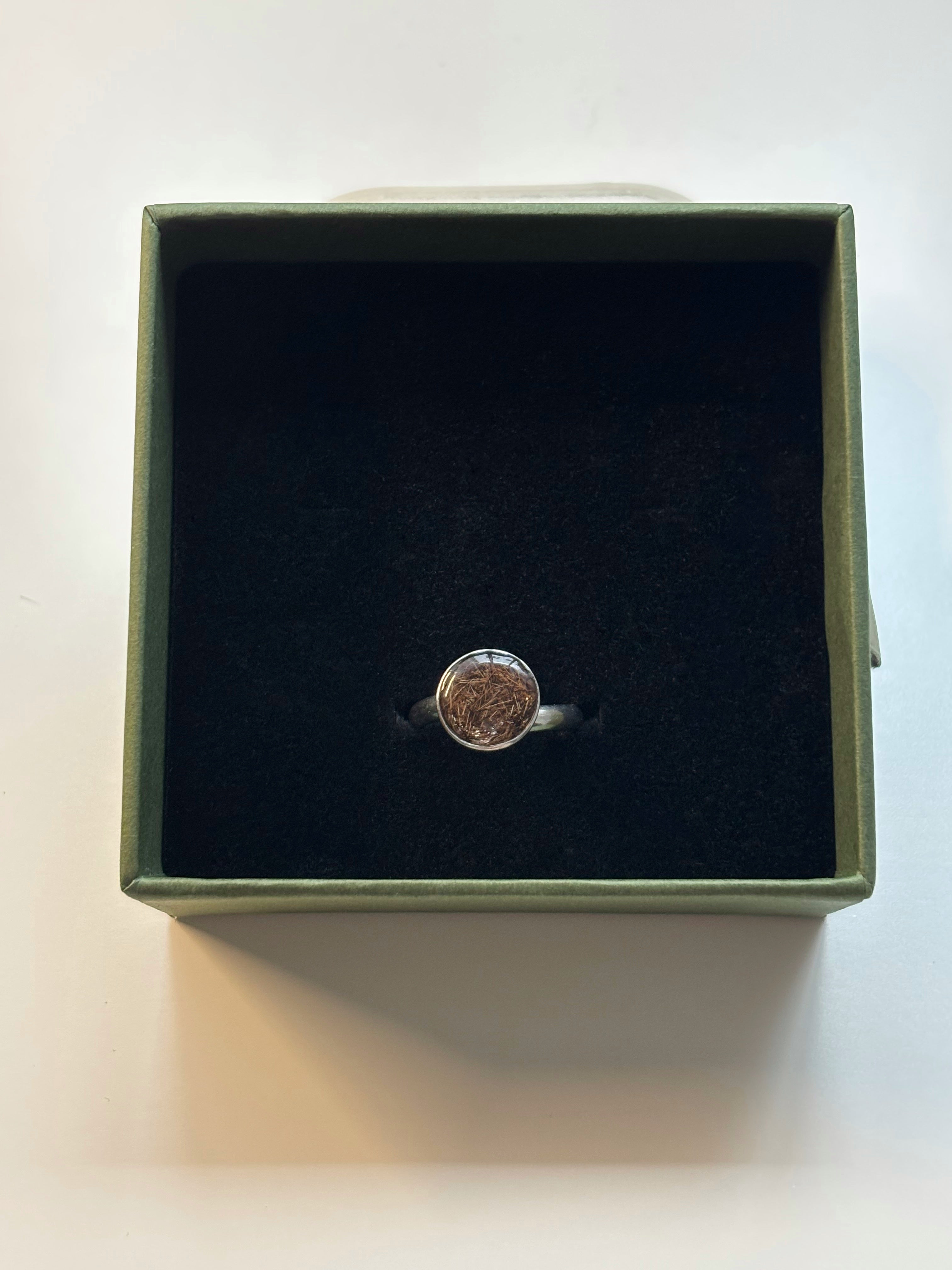 En lugar de una piedra convencional, este anillo lleva dos piezas creadas artesanalmente con los pelos de tu mascota, cuidadosamente encapsulados en resina transparente de alta resistencia.